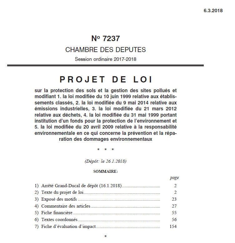 Projet de loi_Protection des sols_26.01.2018 N 7237Am Ufank vum Joer 2018 gouf de Projet zum neie Buedemschutzgesetz presentéiert. Dësen Text behandelt zwee grouss Voleten: Den éischte Volet befaasst sech mat dem präventive Schutz vum Buedem, an engem zweete Volet gëtt sech mat der Problematik vun (potentiell) polluéierte Sitte befaasst.